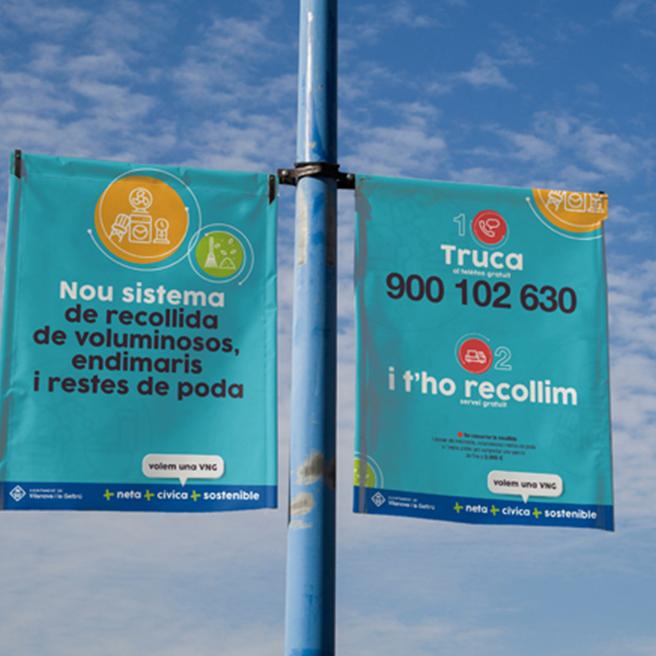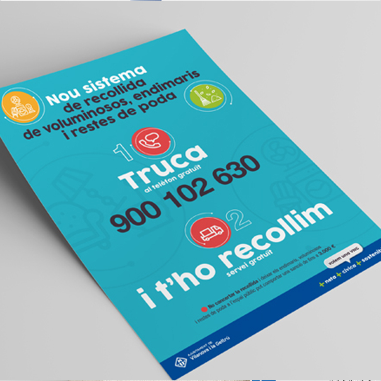 • Títol descriptiu i immediat:Nou sistema de recollida de voluminosos, endimaris i restes de poda”, col·locat a la part superior amb tipografia llegible i contrastada. Aquest encapçalament situa el servei en el seu context funcional i evita ambigüitats.