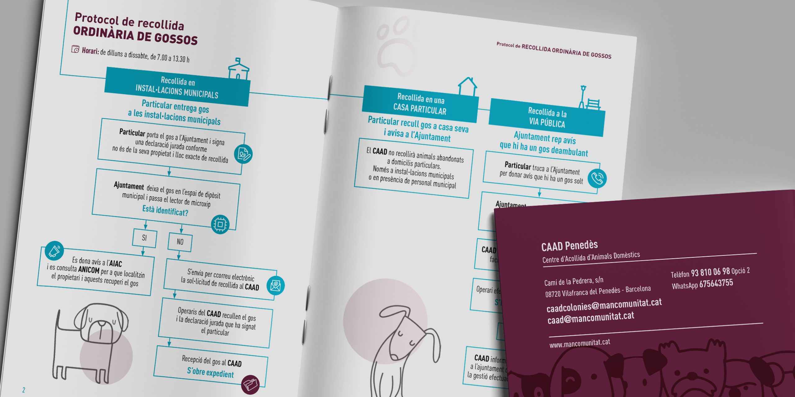 En aquest projecte, l’encàrrec consistia a traduir en una estructura visual clara i funcional un conjunt de normatives i procediments tècnics destinats a l’equip del CAAD Penedès i als ajuntaments col·laboradors. El resultat és un document de Protocols d’actuació amb una identitat gràfica consistent i enfocada a facilitar la comprensió i l’ús operatiu del contingut.